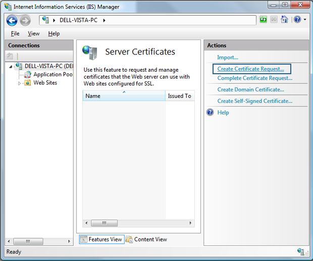 In addition to the new method of requesting and installing ssl certificates, iis 7 includes the ability to If you add a certificate to iis manager server certificates section using complete certificate request that appears without error but then is not visible the next time you go to. The certificate request process varies by certificate company, so i can't really provide the exact steps for the certificate request. This means that there is no longer an iis console to generate a certificate request with.