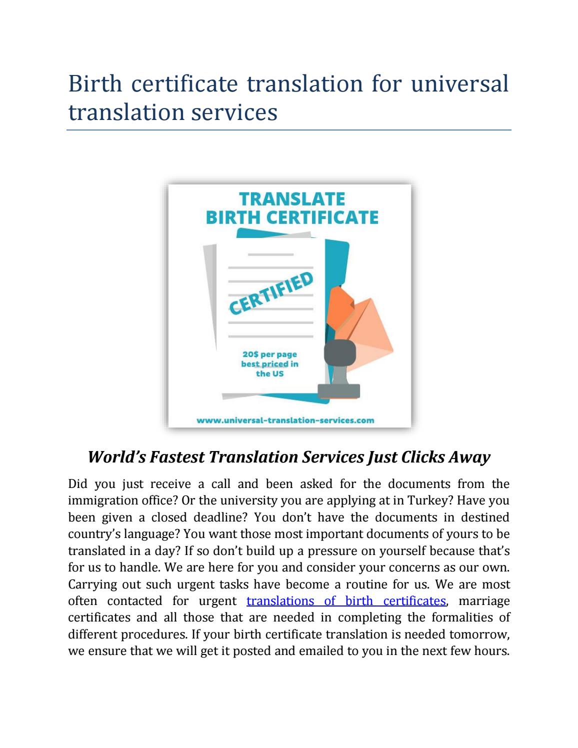 33+ Birth Certificate Translation Certified Images. We know you urgently need your birth certificate or any other personal document translated fast and we strive to provide you with just that! Certified translation provides birth certificate translation services at only $20 per page, fully accepted by uscis, with if you're immigrating in the us and your birth certificate is not in english, you need to use birth certificate translation services in order to have it translated and certified.