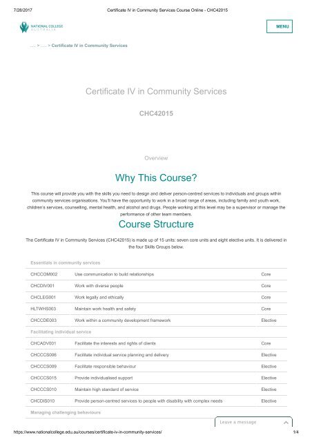 This will bring special encouragement and opportunities to the scheduled. Seven of the units/courses are core requirements. The program accepts both emerging and experienced professionals after taking all five courses in the program you will earn a centennial college community services management certificate that you can add to your. As a community services worker, you provide support, advocacy or interventions to individual clients, groups or communities across a range of to be awarded the certificate iv of community services you will need to complete 15 units of competency.